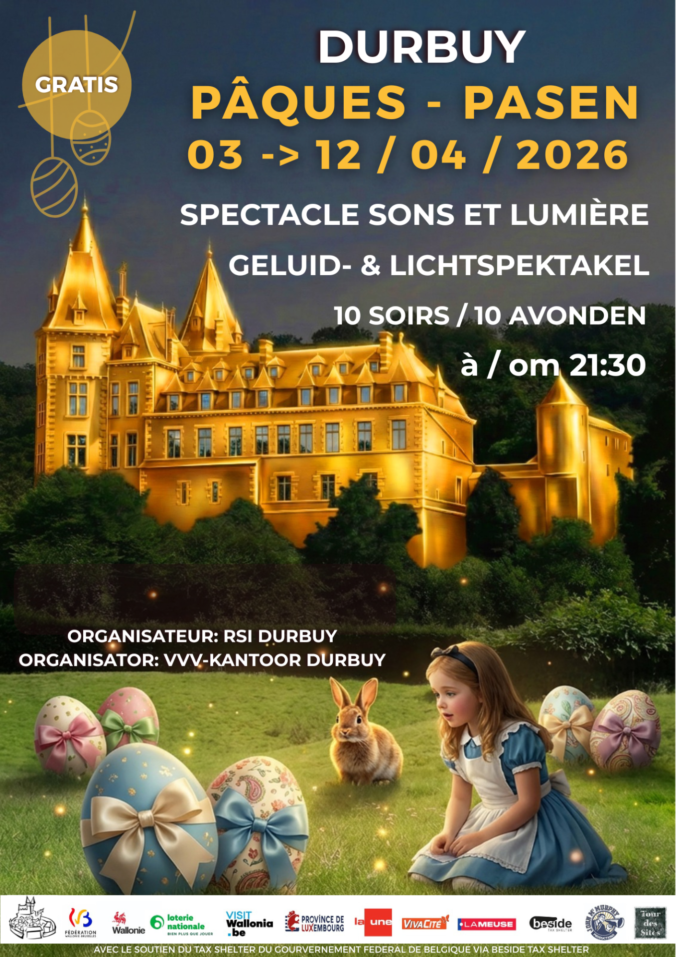 Durbuy TourismeDurbuy sonne les cloches Durbuy sonne les cloches Du 3 au 12 avril 2026 Spectacle son et lumière, présence s’artistes. Accès gratuit.